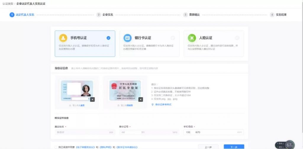认证操作过程中,企业法人需要填写正确的企业名称(已认证的)、手持身份证正反面拍照、上传营业执照照片、对公账户认证(银行对公支付一分钱)的方式完成注册和认证,确保签约主体的唯一性、不可抵赖性。