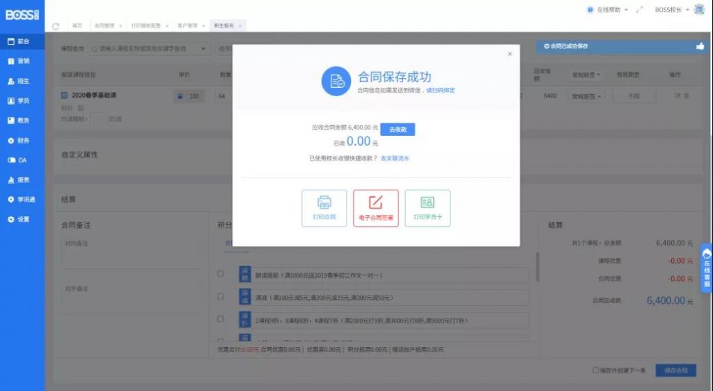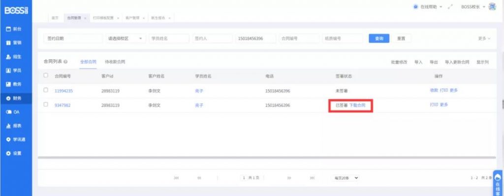 而现在,在学邦技术|BOSS系统上录了合同之后只需要点击一下,家长即可签署,系统中合同签署状态即时更新。