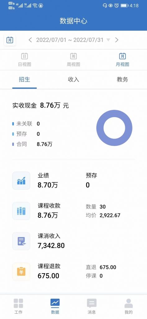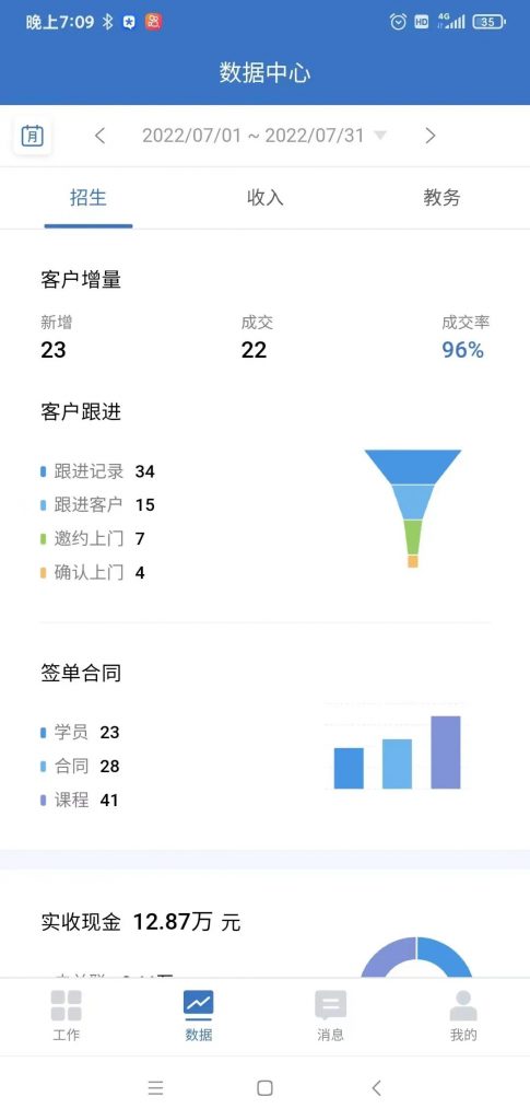 3.借助权限设置,相关人员可即时了解不同时间段的签单情况,随时知道校区的收入和招生情况;
