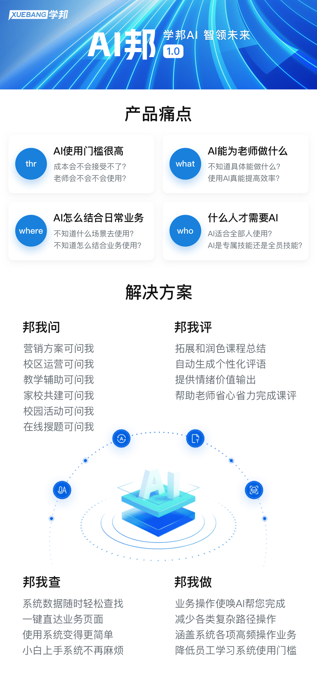 5月16日,学邦技术再一次引领行业,发布教培行业教务管理系统AI落地应用功能 – AI邦,1.0版本包括邦我问、邦我查、邦我做、邦我评四大功能助力机构快速进入AI时代,用AI赋能教育机构发展!