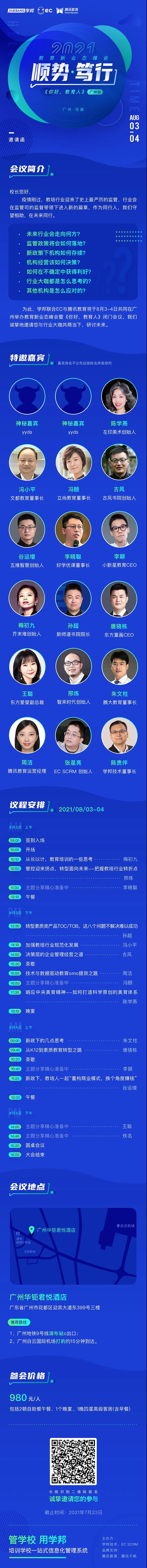 学邦联合EC、腾讯教育将于8月3-4日在广州•花都举办2021教育新业态峰会暨《你好,教育人》闭门会议。本次峰会的主题是顺势•笃行,诚挚邀请您的莅临。