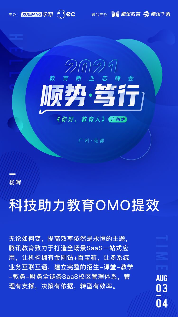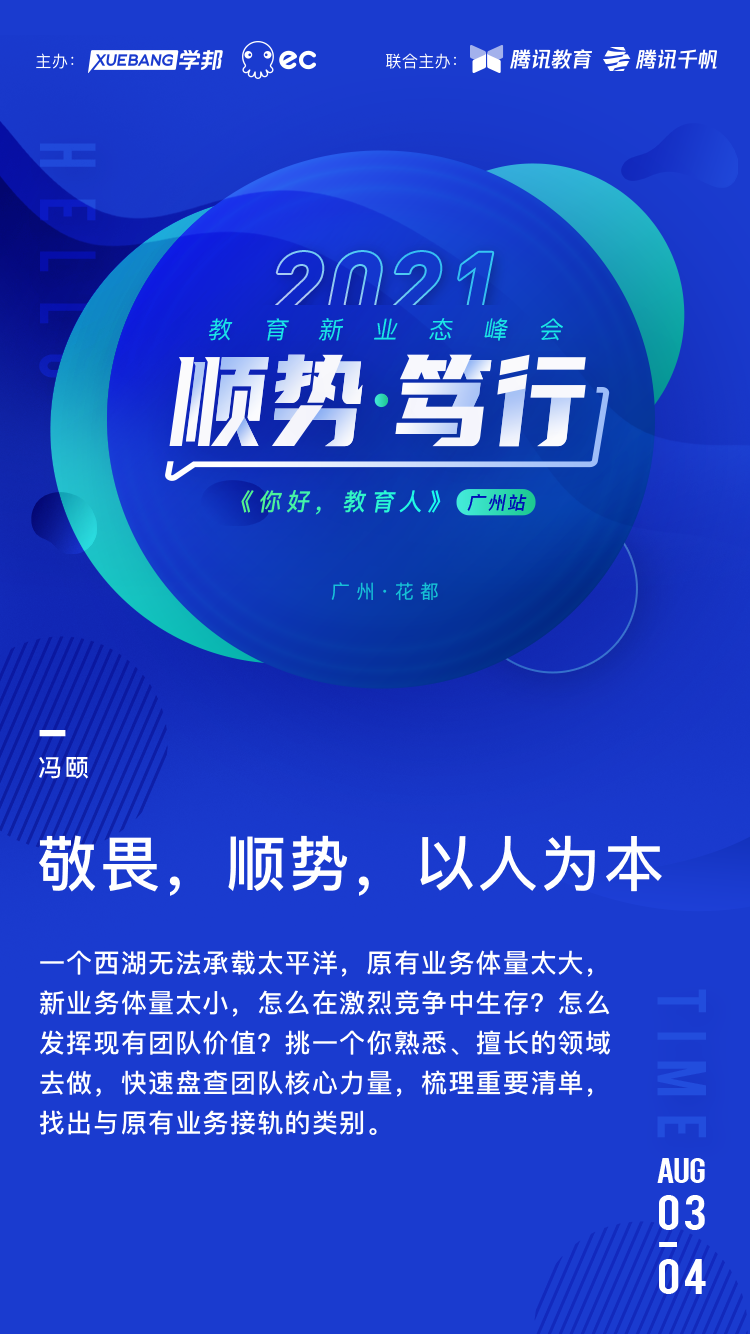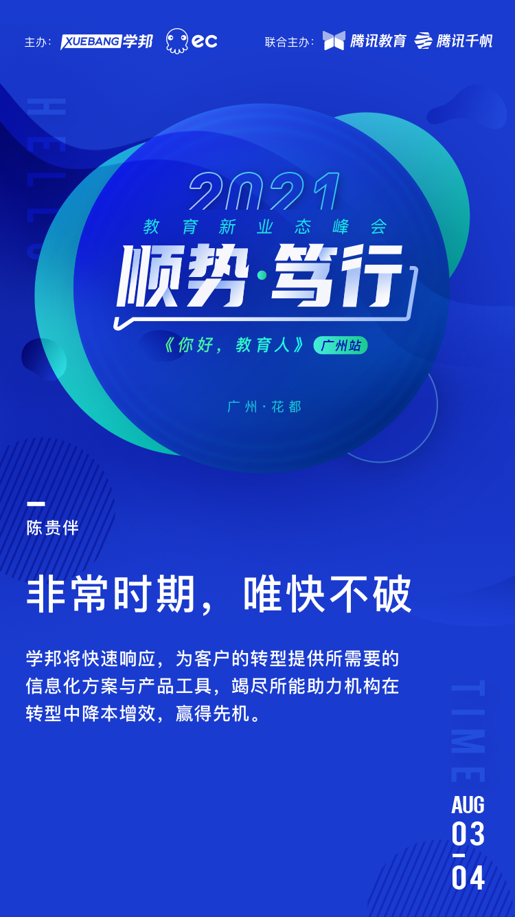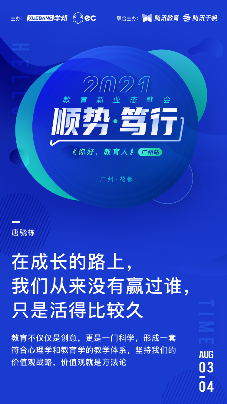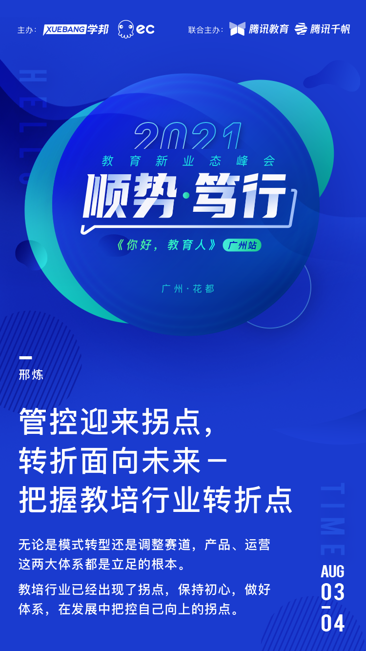 此次峰会由学邦技术联合EC、腾讯教育共同举办,主题为顺势•笃行,旨在探索如何顺应时势,把握好行业转折点,选对赛道,笃定前行!